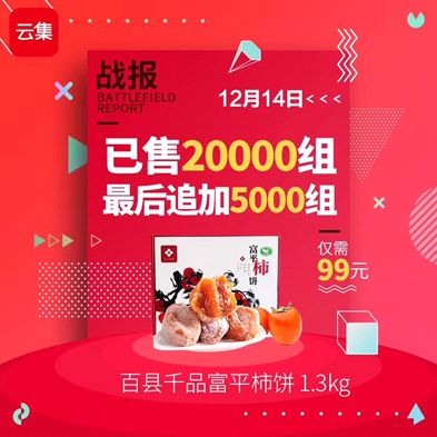 2017年12月中旬,按照新标准打造的首批富平柿饼正式在云集微店上线。通过云集微店覆盖全国各地的280多万店主的分享,富平柿饼品牌信息飞速传播,触达至上千万终端消费者。上线仅1小时, 2.6万斤首批上线的柿饼就被一抢而光,截至12月底,云集微店共售出7万单富平柿饼,销售额达到700万。