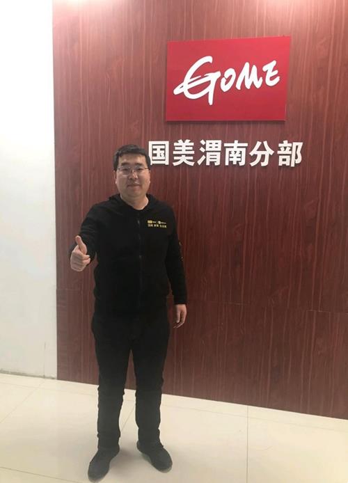 图为国美集团渭南城市分公司总经理宋杰为税务小灵通点赞。